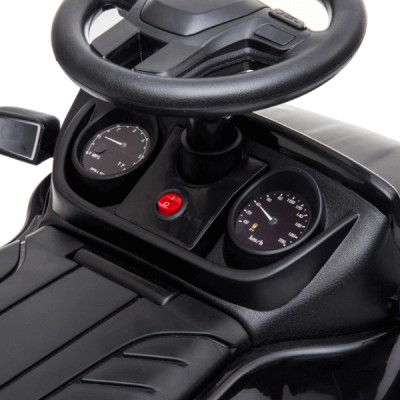 Cuenta con un botón para activar las luces delanteras y sus ruedas de plástico incluyen bandas de goma. Disponible en color rojo y negro. Peso máximo soportado: 23 kg.